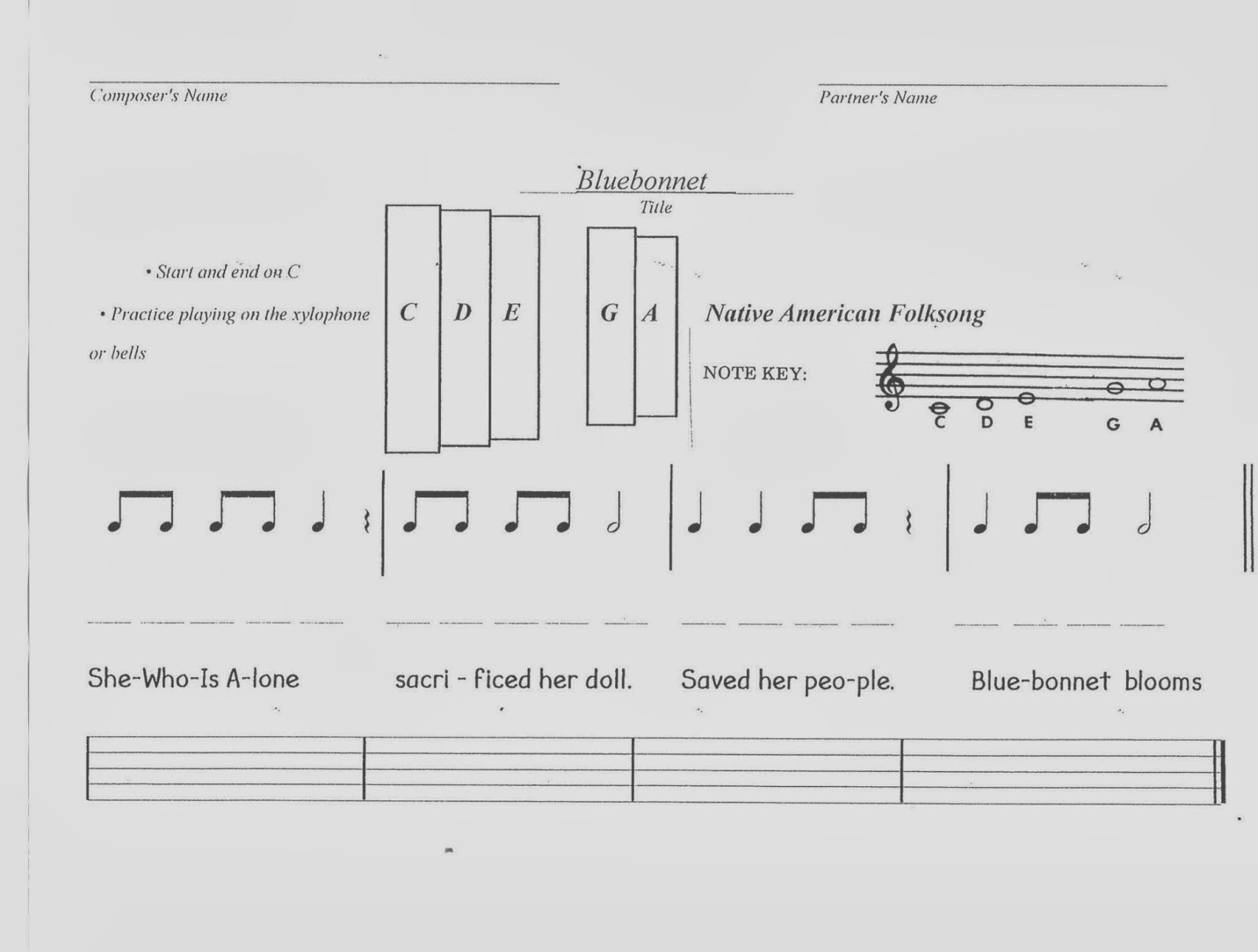 Then we identify the five W's. I use their answers to create a poem about Bluebonnet. Together we review rhythms using the poem. Then, we use the poem along with the rhythms to create our own pieces using xylophones.